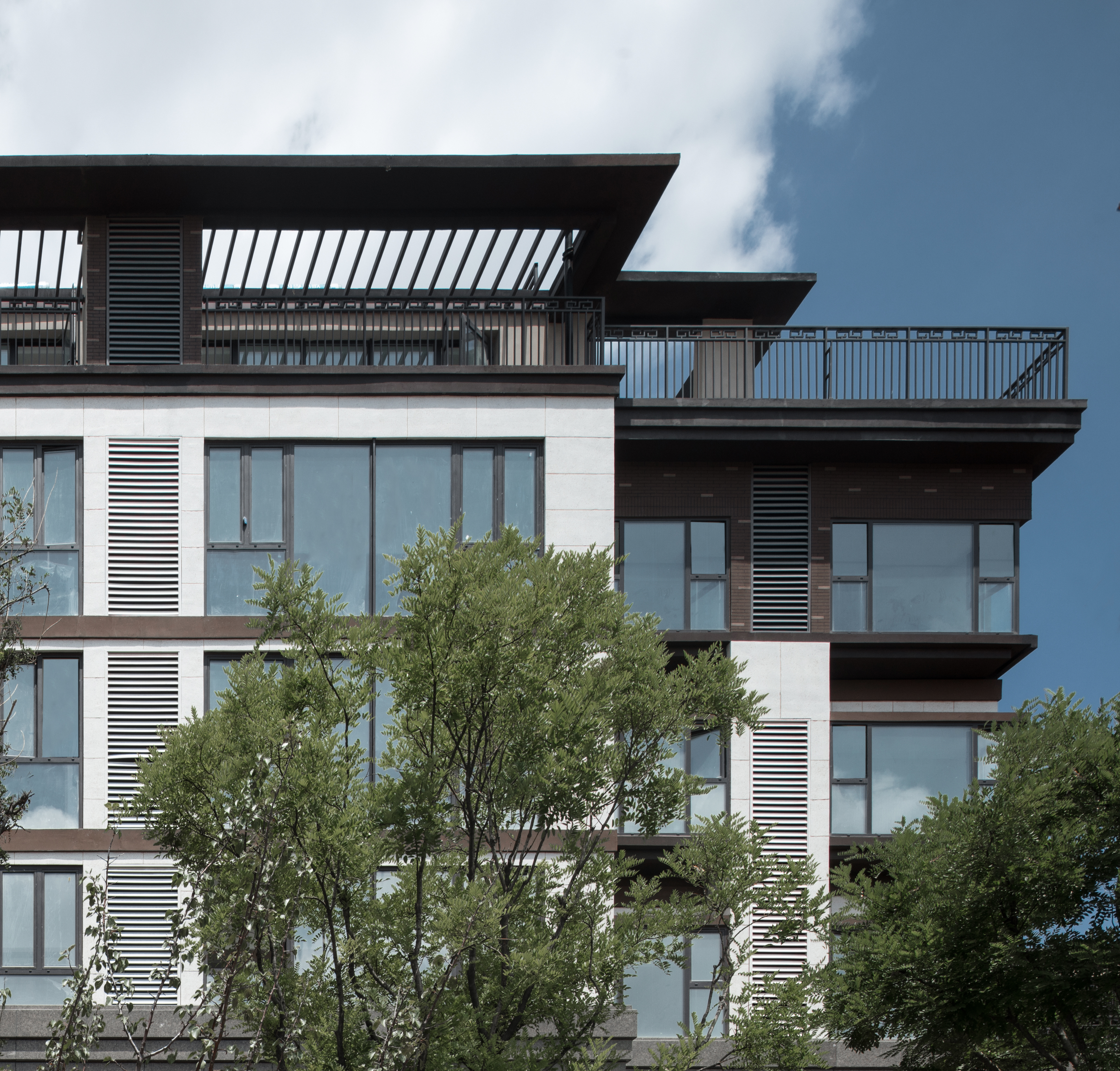 浅色主墙面和深色饰面交替使用,表现为立面上强烈的材料的穿插感,