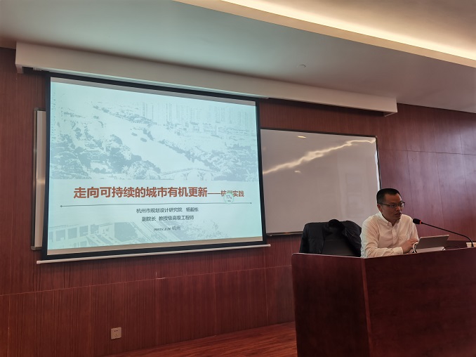 杨毅栋院长作题为《走向可持续的城市有机更新——杭州实践》的专题讲座。他首先介绍了城市更新相关的概念内涵、发展趋势和模式。城市更新是一种将城市中已经不适应现代化城市社会生活的地区作必要的、有计划的改建活动,国内城市比较成熟的更新体系主要有两种:以改造地区的用地类型划分的用地分类更新模式(代表城市广州、上海);以改造手段、方法划分策略分类更新模式(代表城市深圳)。随后,他以杭州城市更新的历程为例,重点介绍了“空间换地”、“遗产保护”、“综合整治”三大政策,结合杭州案例,给出了自己对城市有机更新的思考。