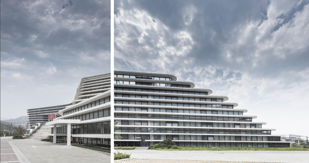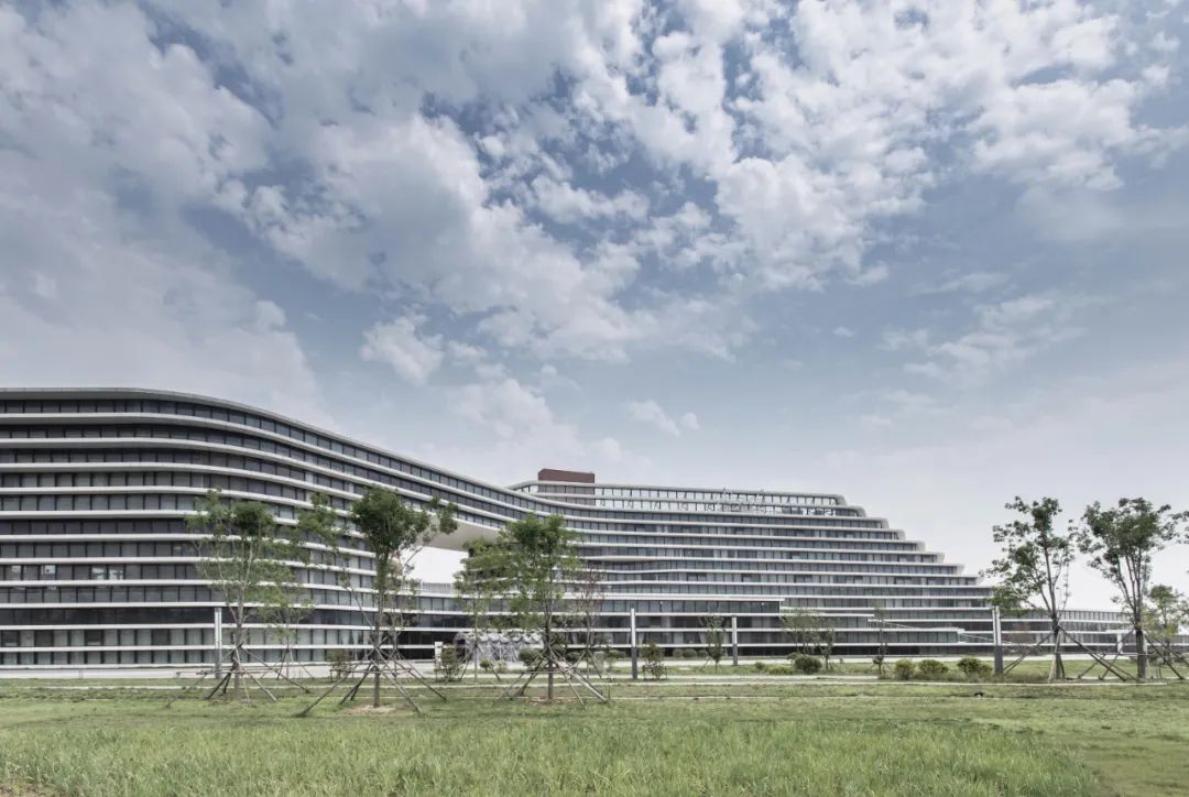 建筑体量形成简单、冲突的场地氛围,建筑南向正对园区中轴线,使得水平向延展的建筑生成了“东高西低”的无边际界面。