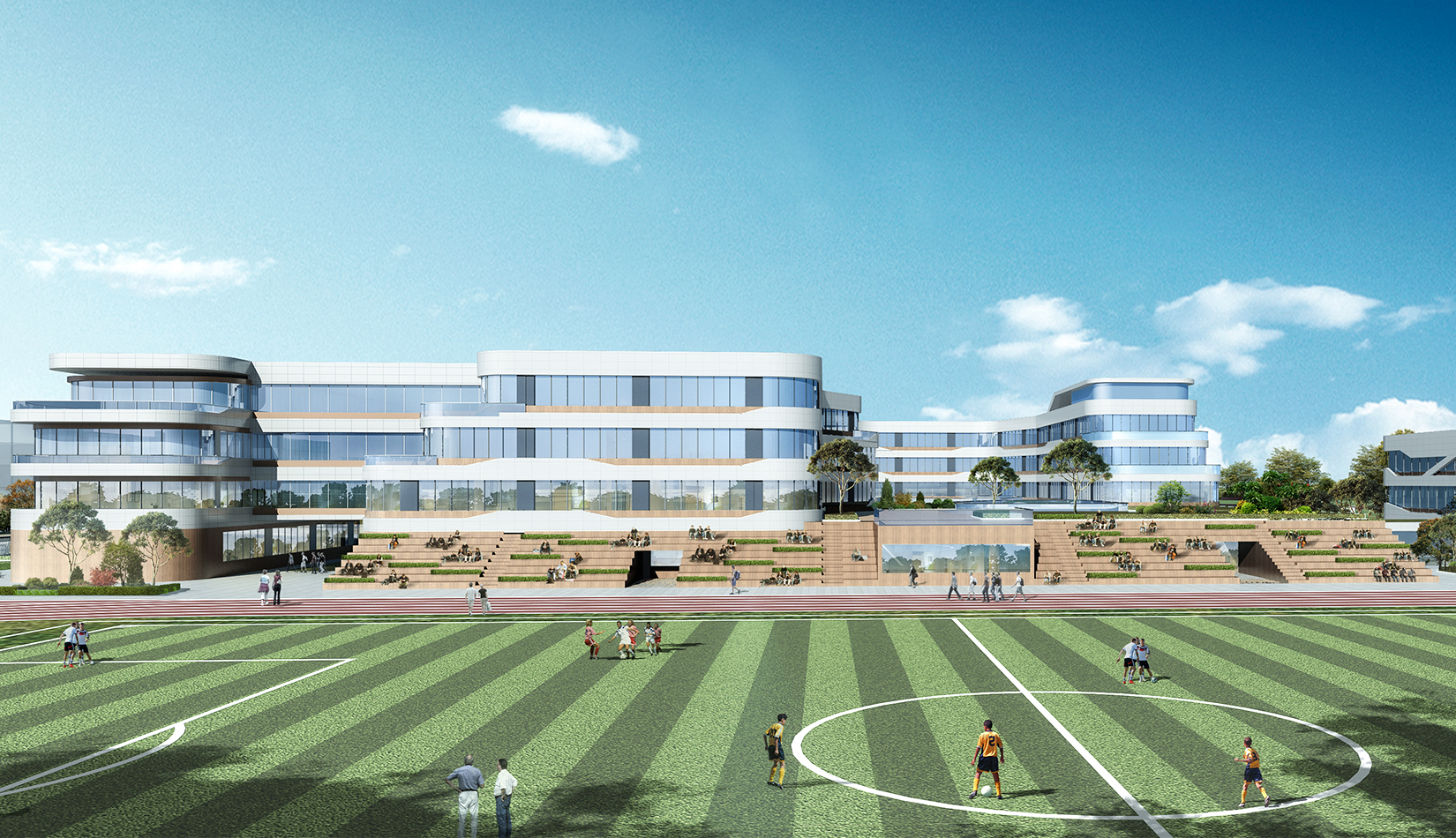 充满绿化的连续平台接通各教学楼,在东西南北方向形成内院,由西向东侧延伸,与操场融为一体,提供了良好的视觉穿透性。建筑风格现代富有动感,线条流畅,形成强烈的可识别性。